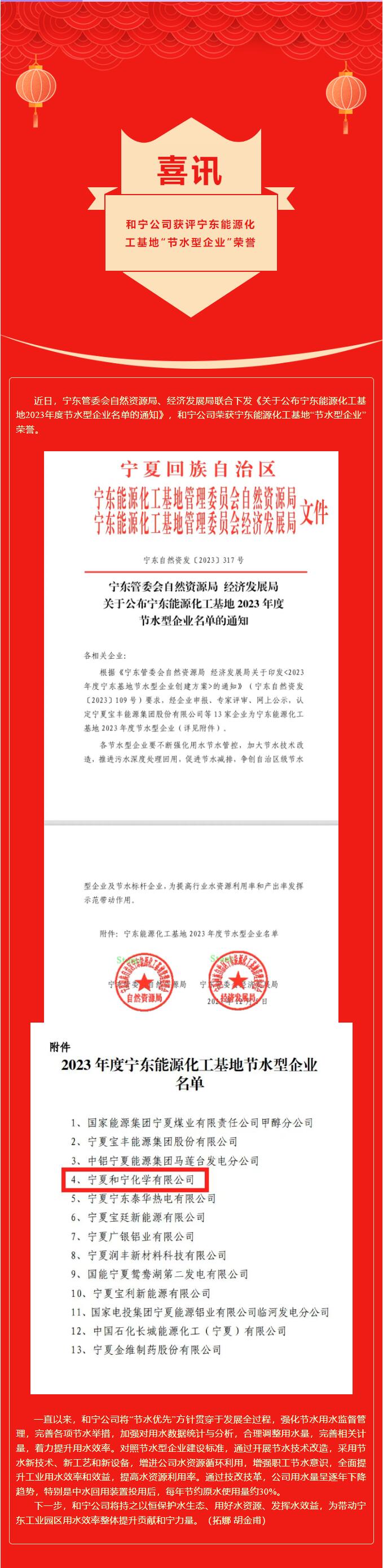 喜訊!和寧公司獲評寧東能源化工基地2023年度“節水型企業”榮譽