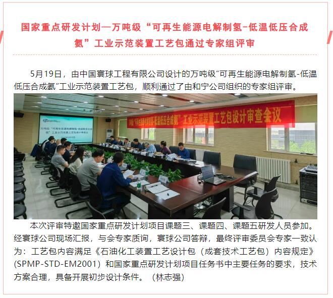 國家重點研發計劃—萬噸級“可再生能源電解制氫-低溫低壓合成氨”工業示范裝置工藝包通過專家組評審