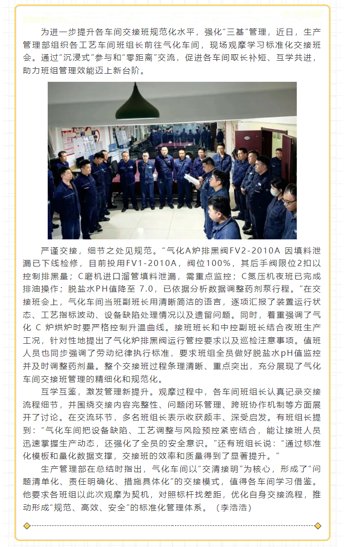 強(qiáng)化“三基”管理——生產(chǎn)管理部組織班組長(zhǎng)觀(guān)摩氣化車(chē)間標(biāo)準(zhǔn)化交接班