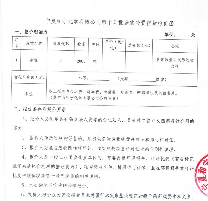 寧夏和寧化學有限公司第十五批雜鹽處置密封報價函.pdf [全文]