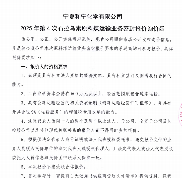 寧夏和寧化學有限公司2025 年第4次石拉烏素原料煤運輸業務密封報價詢價函.pdf [全文]