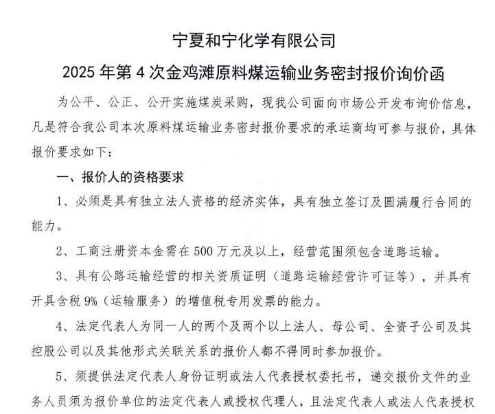 寧夏和寧化學有限公司2025 年第4次金雞灘原料煤運輸業務密封報價詢價函.pdf [全文]