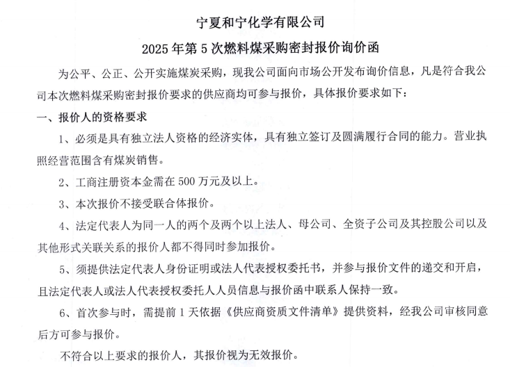 寧夏和寧化學(xué)有限公司2025年第5次燃料煤采購(gòu)密封報(bào)價(jià)詢價(jià)函.pdf [全文]