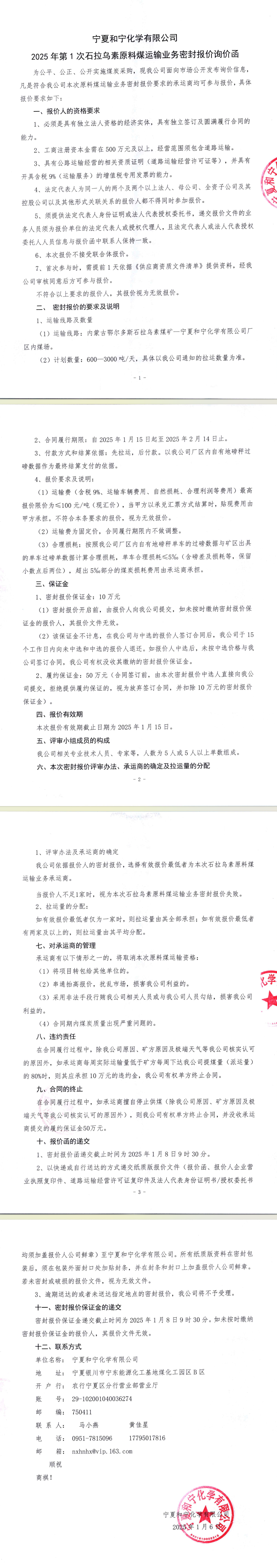 寧夏和寧化學有限公司2025年第1次石拉烏素原料煤運輸業務密封報價詢價函 [全文]