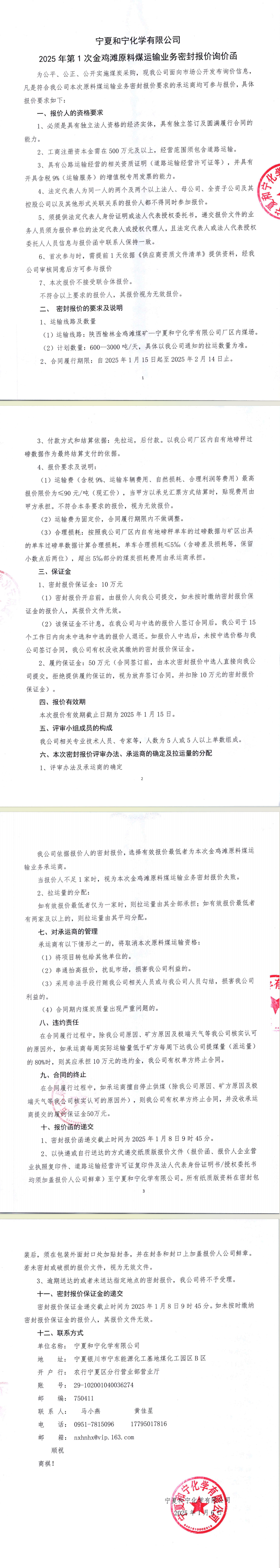 寧夏和寧化學有限公司2025年第1次金雞灘原料煤運輸業務密封報價詢價函 [全文]