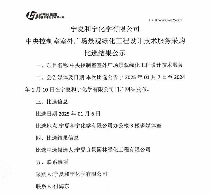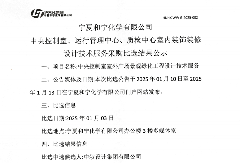 寧夏和寧化學有限公司中央控制室室外廣場景觀綠化工程設計技術服務采購比選結果公示.pdf [全文]