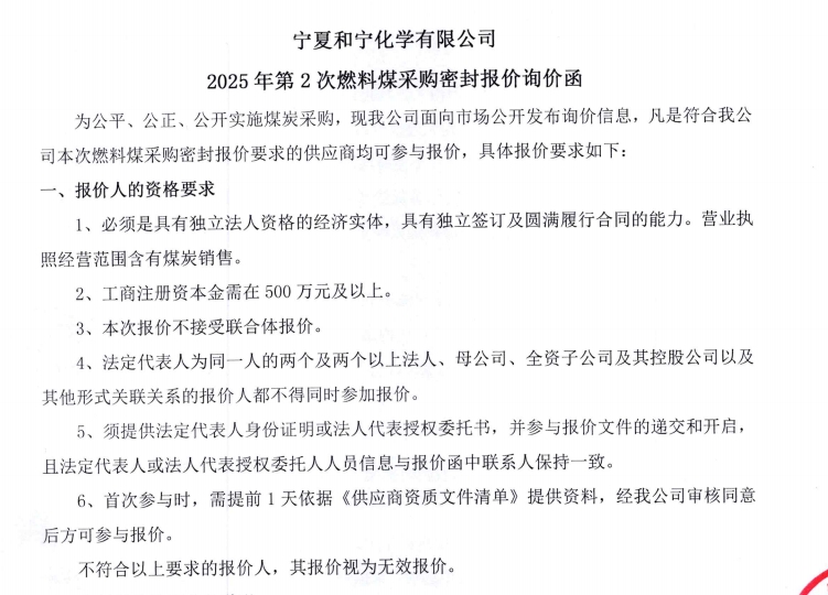 寧夏和寧化學有限公司2025年第2次燃料煤采購密封報價詢價函.pdf [全文]