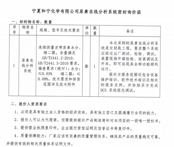 寧夏和寧化學有限公司尿素在線分析系統密封詢價函