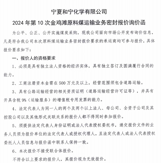 寧夏和寧化學有限公司2024年第10次金雞灘原料煤運輸業務密封報價詢價函