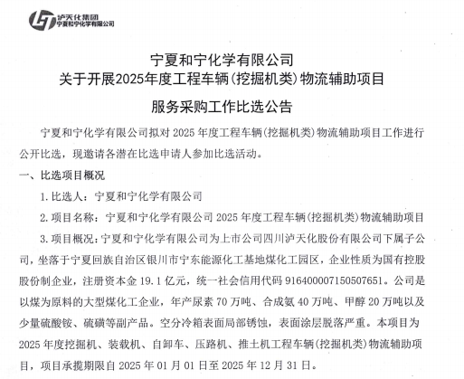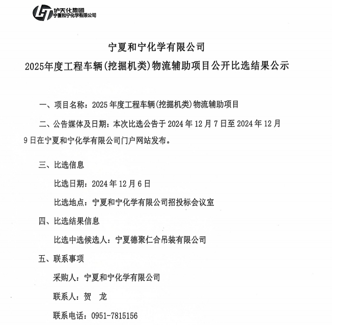 寧夏和寧化學有限公司2025年度工程車輛(挖掘機類)物流輔助項目公開比選結果公示.pdf [全文]