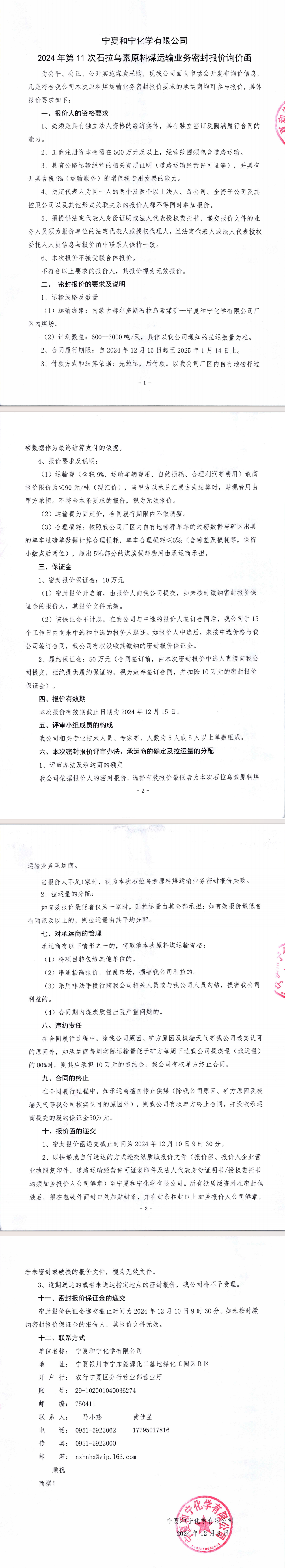 寧夏和寧化學有限公司2024年第11次石拉烏素原料煤運輸業務密封報價詢價函(1)