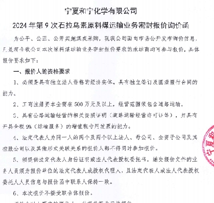 寧夏和寧化學有限公司2024年第9次石拉烏素原料煤運輸業務密封報價詢價函.pdf [全文]
