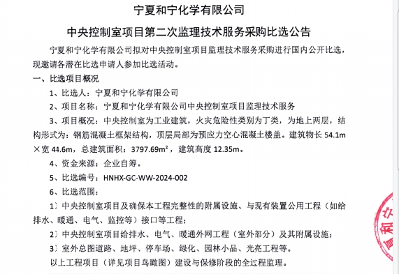 寧夏和寧化學有限公司中央控制室項目第二次監理技術服務采購比選公告