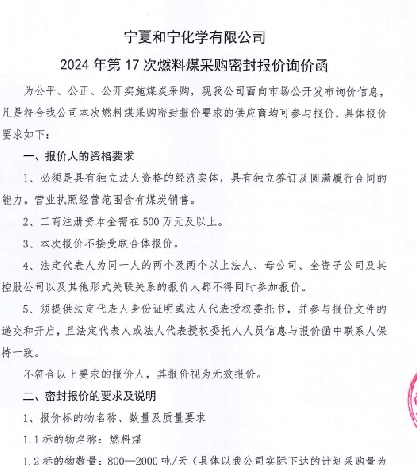 寧夏和寧化學有限公司2024年第17次燃料煤采購密封報價詢價函