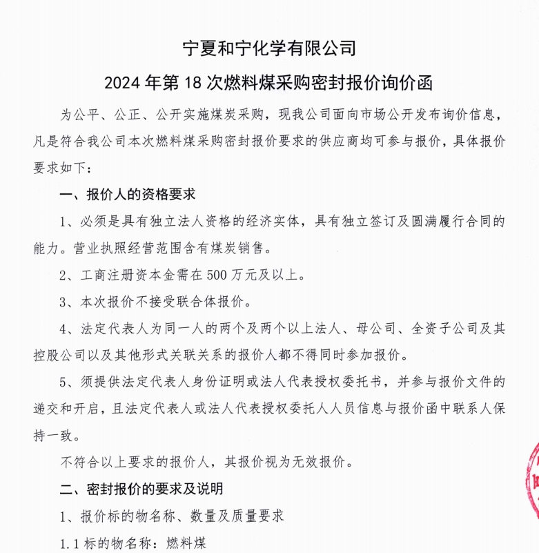 寧夏和寧化學有限公司2024 年第 18 次燃料煤采購密封報價詢價函.pdf [全文]