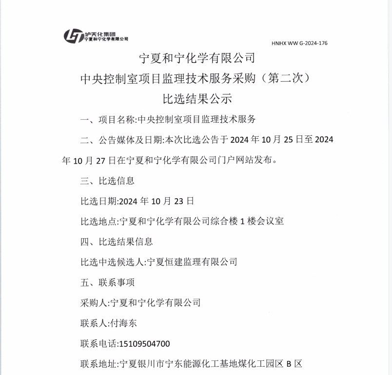 寧夏和寧化學有限公司中央控制室項目監理技術服務采購比選結果公示(第二次)