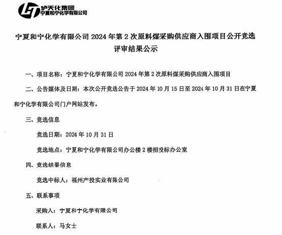 寧夏和寧化學有限公司2024年第2次原料煤采購供應商入圍項目公開競選評審結果公示