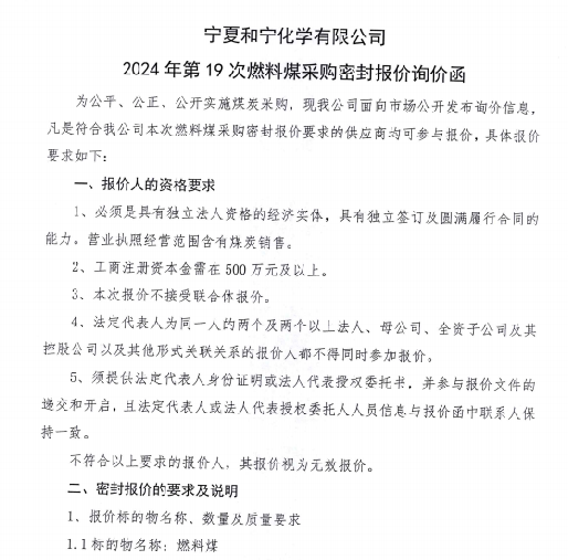 寧夏和寧化學有限公司2024年第19次燃料煤采購密封報價詢價函.pdf [全文]