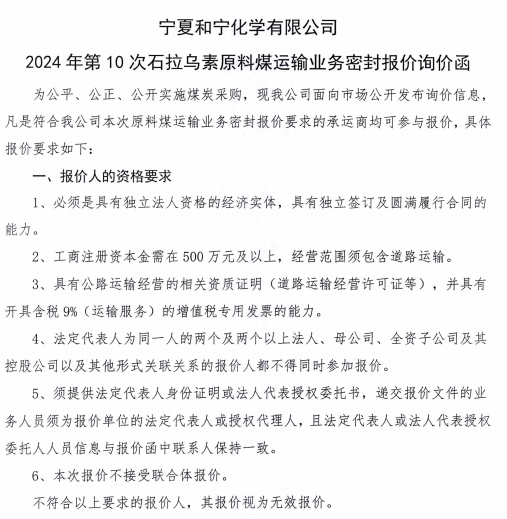 寧夏和寧化學有限公司2024年第10次石拉烏素原料煤運輸業務密封報價詢價函.pdf [全文]