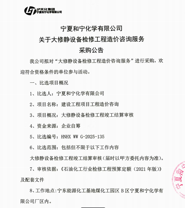 寧夏和寧化學(xué)有限公司關(guān)于大修靜設(shè)備檢修工程造價(jià)咨詢服務(wù)采購(gòu)公告.pdf [全文]