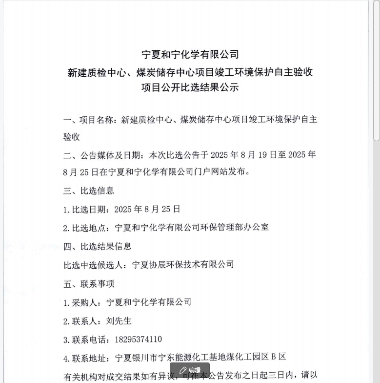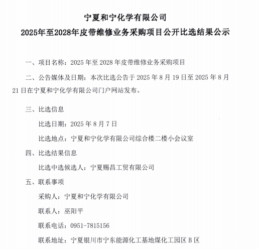 寧夏和寧化學有限公司2025年至2028年皮帶維修業務采購項目公開比選結果公示.pdf [全文]
