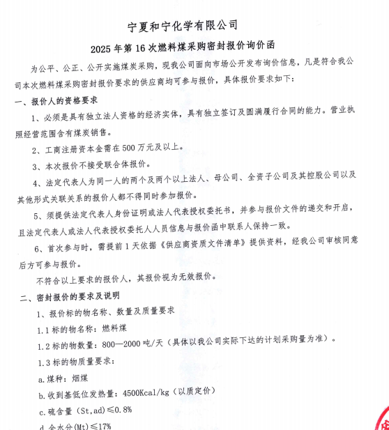 寧夏和寧化學有限公司2025年第16次燃料煤采購密封報價詢價函.pdf [全文]