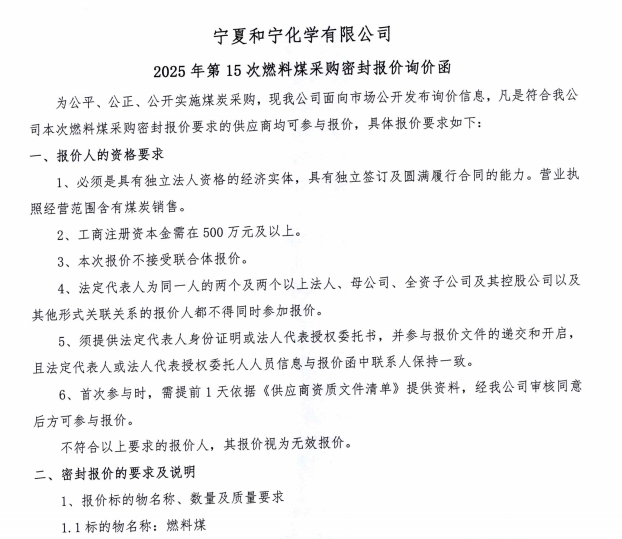 寧夏和寧化學(xué)有限公司2025年第15次燃料煤采購(gòu)密封報(bào)價(jià)詢(xún)價(jià)函.pdf [全文]
