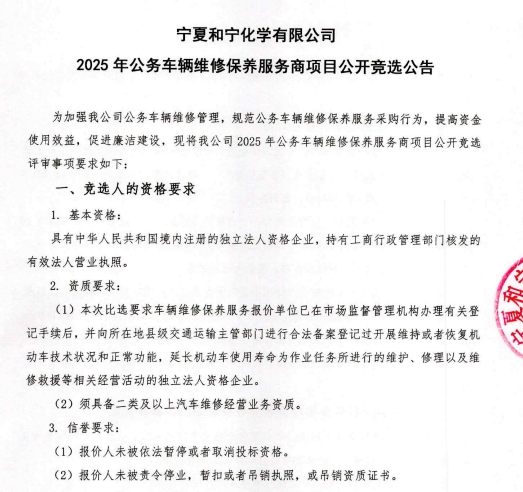 寧夏和寧化學有限公司2025 年公務車輛維修保養服務商項目公開競選公告.pdf [全文]