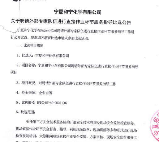 寧夏和寧化學有限公司關于聘請外部專家隊伍進行直接作業環節服務指導比選公告.pdf [全文]