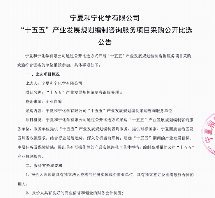 寧夏和寧化學(xué)有限公司“十五五”產(chǎn)業(yè)發(fā)展規(guī)劃編制咨詢服務(wù)項(xiàng)目采購公開比選公告.pdf [全文]