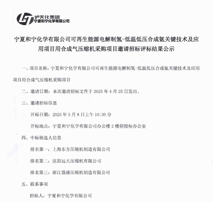 寧夏和寧化學(xué)有限公司可再生能源電解制氫一低溫低壓合成氨關(guān)鍵技術(shù)及應(yīng)用項(xiàng)目用合成氣壓縮機(jī)采購項(xiàng)目邀請(qǐng)招標(biāo)評(píng)標(biāo)結(jié)果公示.pdf [全文]