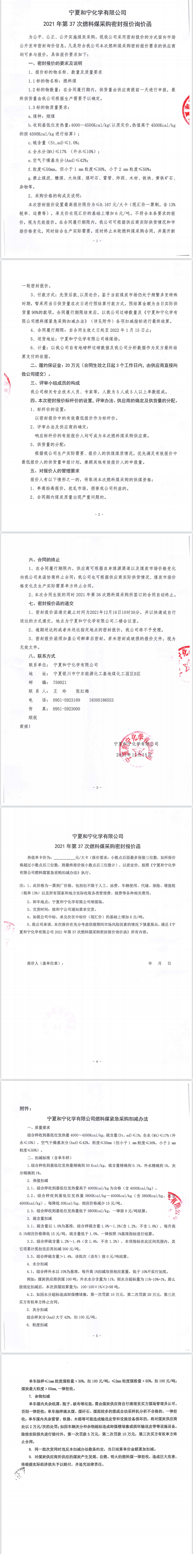 2021年第37次燃料煤采購密封報價詢價函及報價函