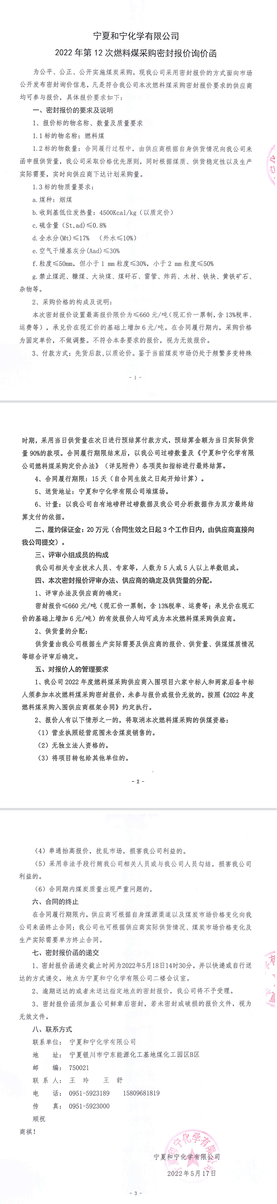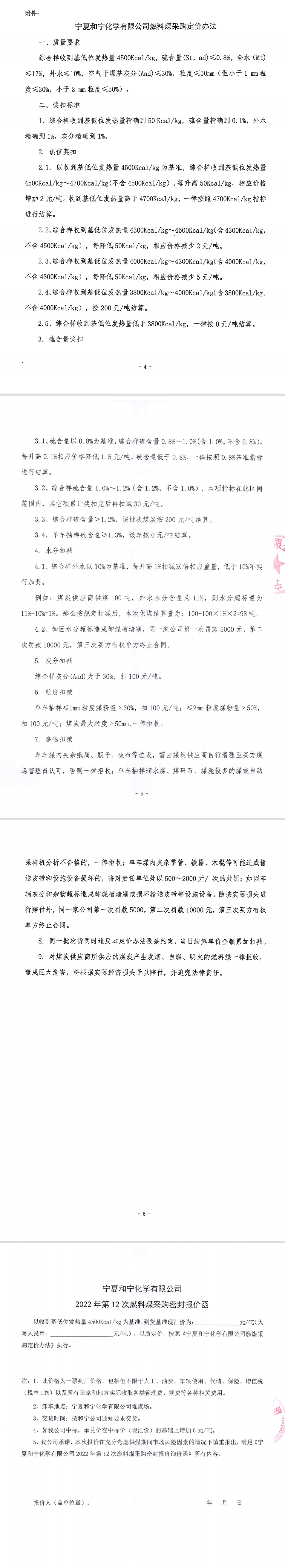 寧夏和寧化學有限公司2022年第12次燃料煤采購密封報價詢價函
