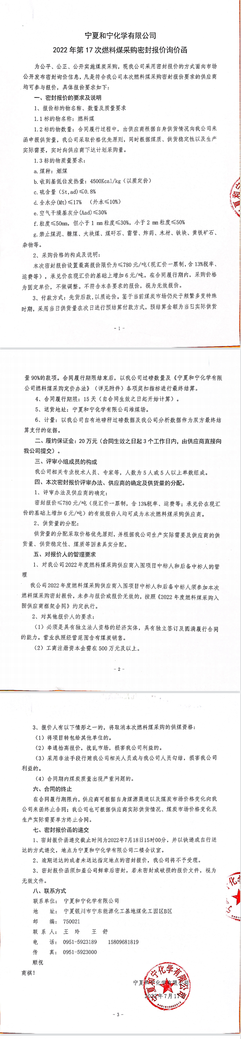 寧夏和寧化學有限公司2022年第17次燃料煤采購密封報價詢價函