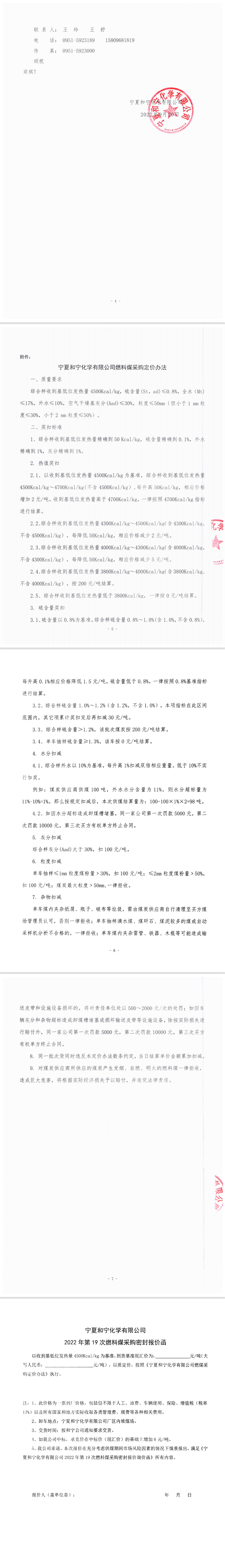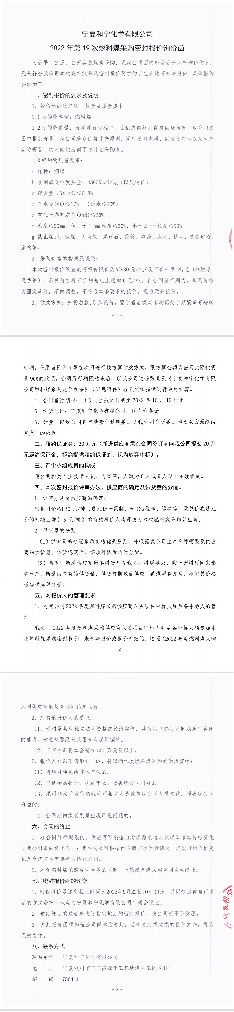 寧夏和寧化學有限公司2022年第19次燃料煤采購密封報價詢價函