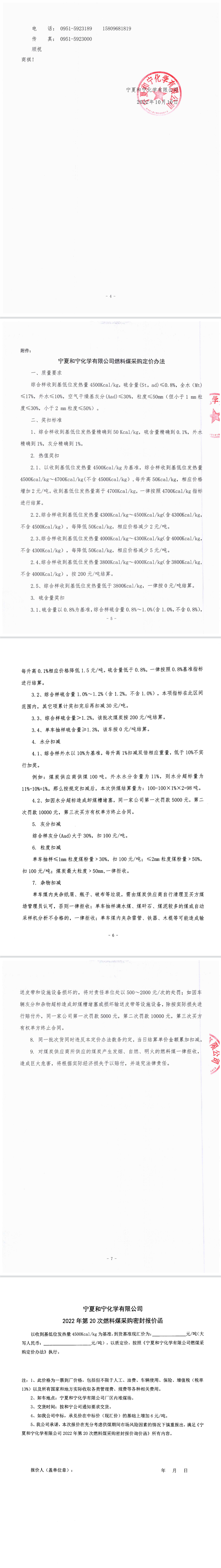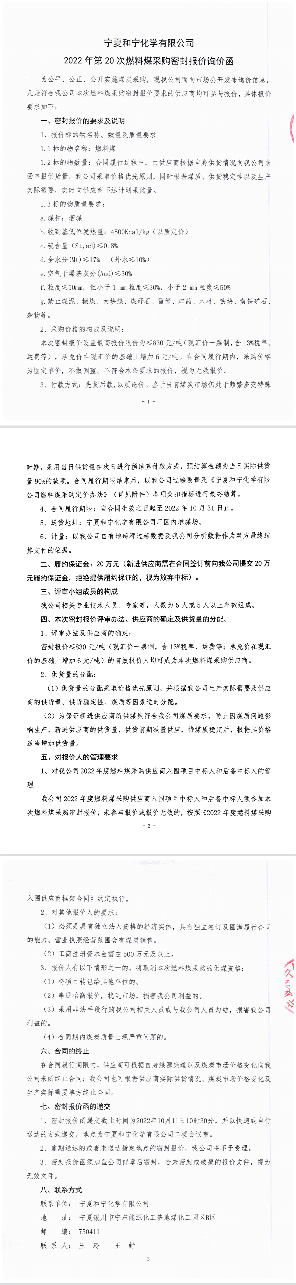 寧夏和寧化學(xué)有限公司2022年第20次燃料煤采購密封報價詢價函