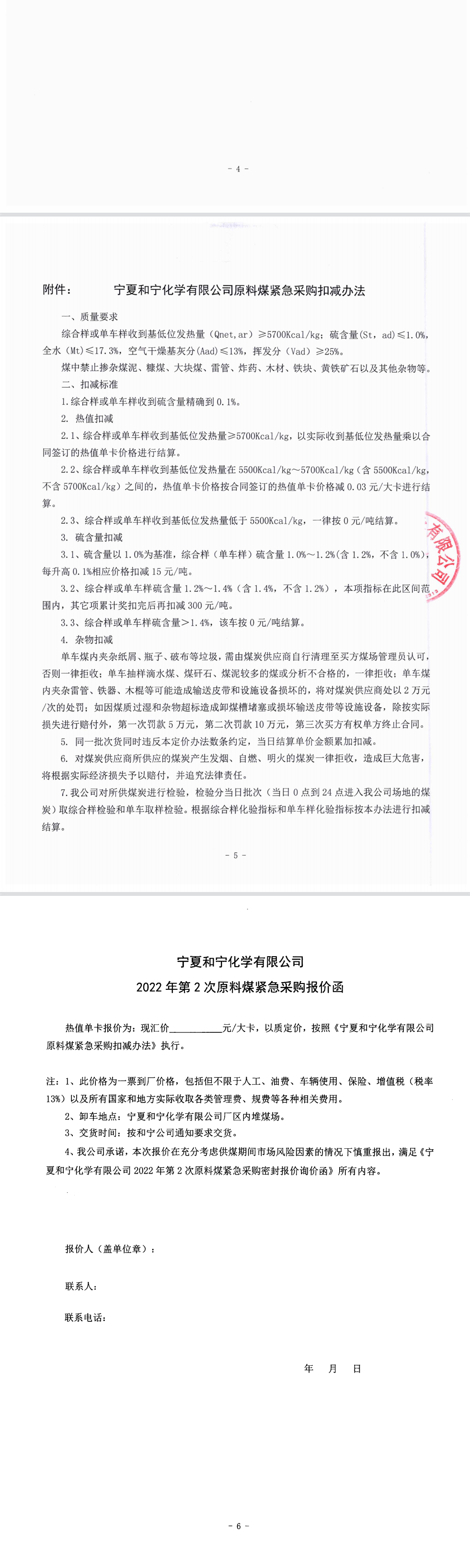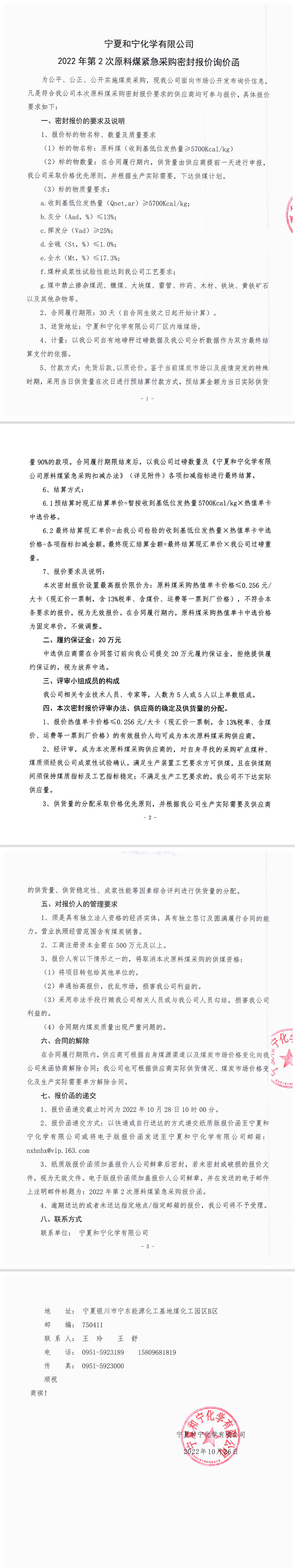 寧夏和寧化學有限公司2022年第2次原料煤緊急采購密封報價詢價函
