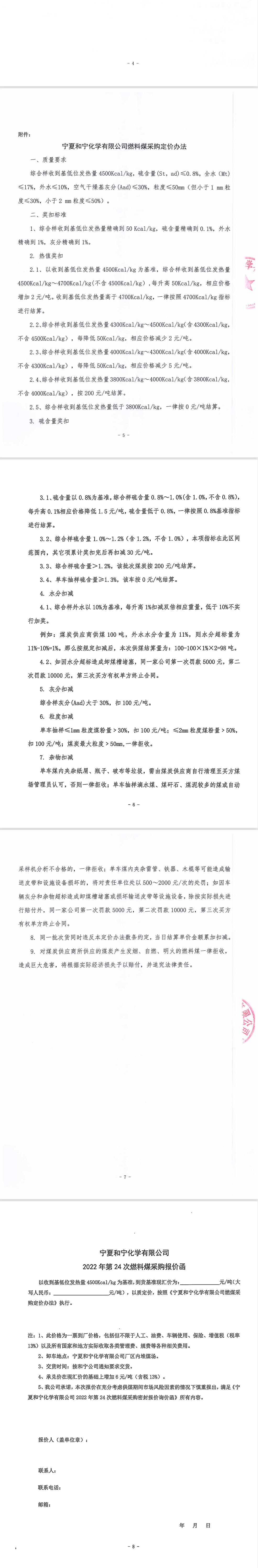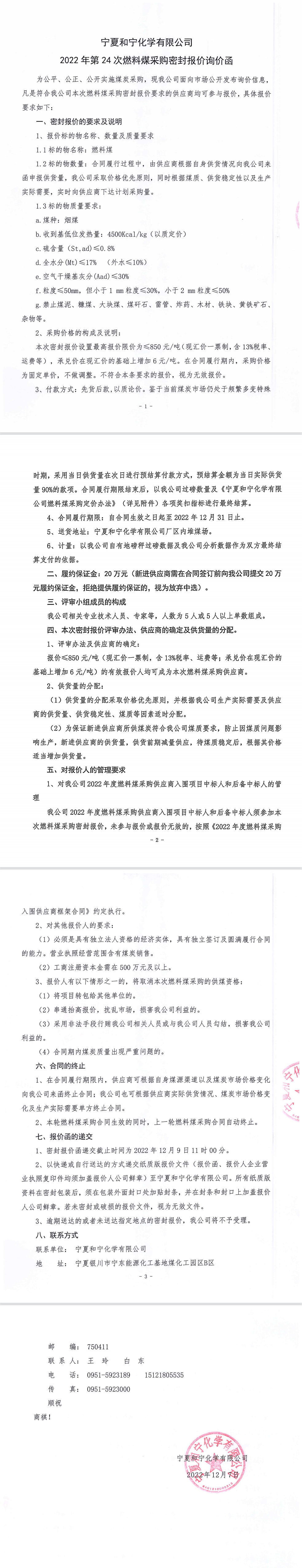 寧夏和寧化學有限公司2022年第24次燃料煤采購密封報價詢價函