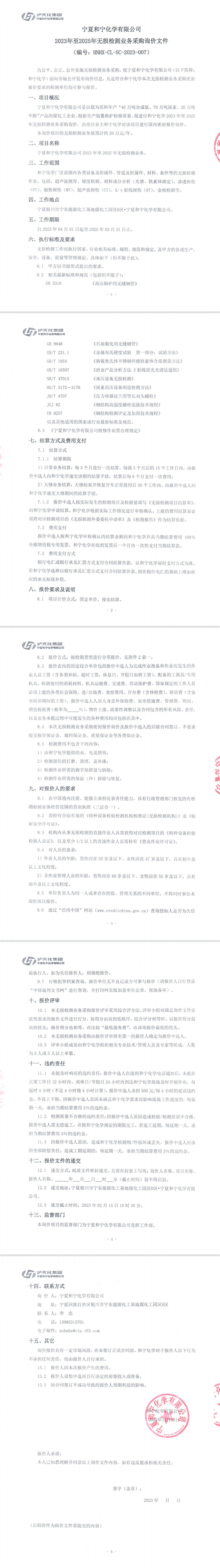 寧夏和寧化學有限公司•2023年至2025年無損檢測業務采購詢價文件