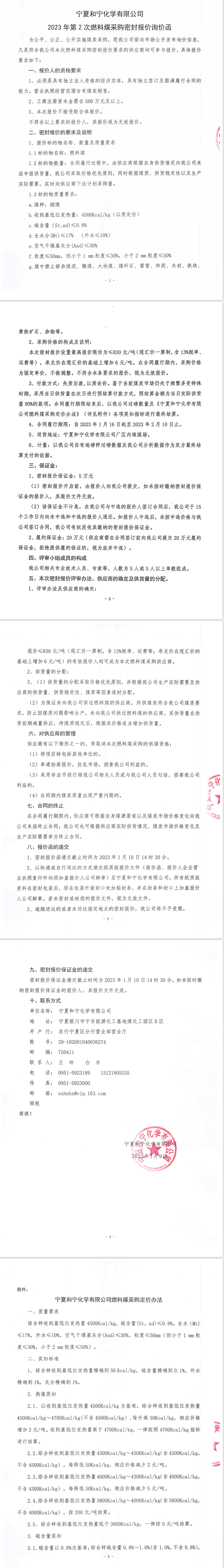 寧夏和寧化學有限公司2023年第2次燃料煤采購密封報價詢價函