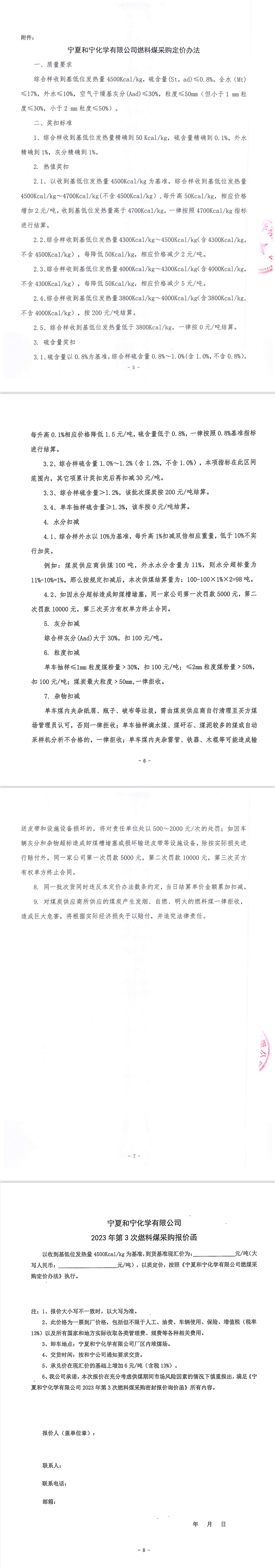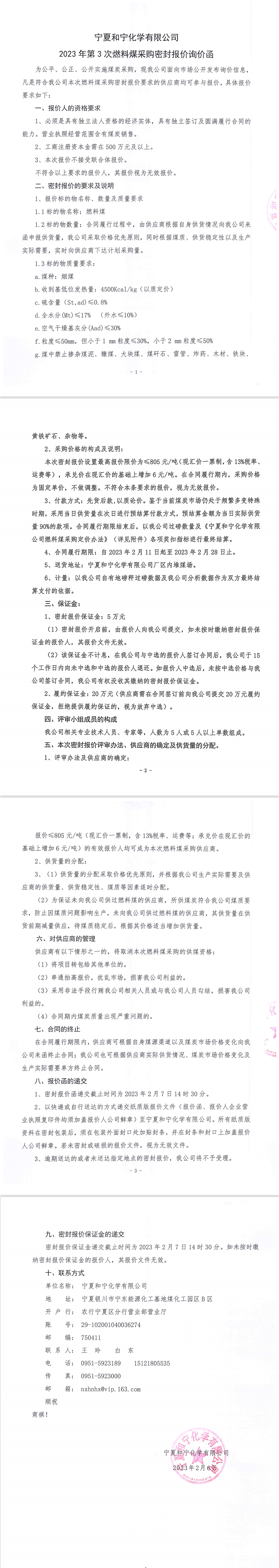 寧夏和寧化學有限公司2023年第3次燃料煤采購密封報價詢價函