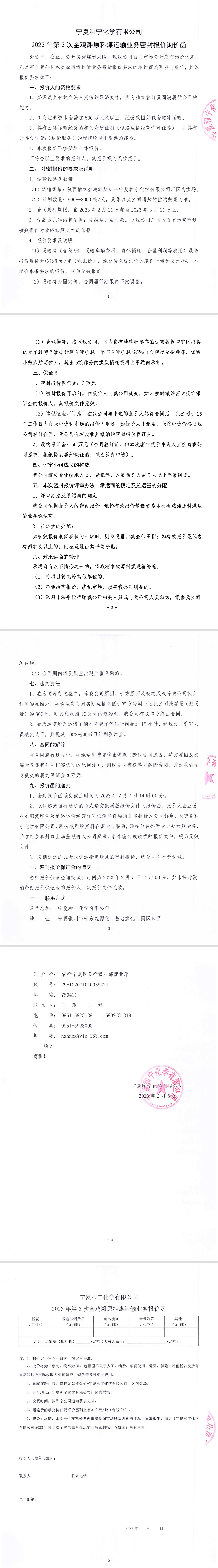 寧夏和寧化學有限公司2023年第3次金雞灘原料煤運輸業務密封報價詢價函