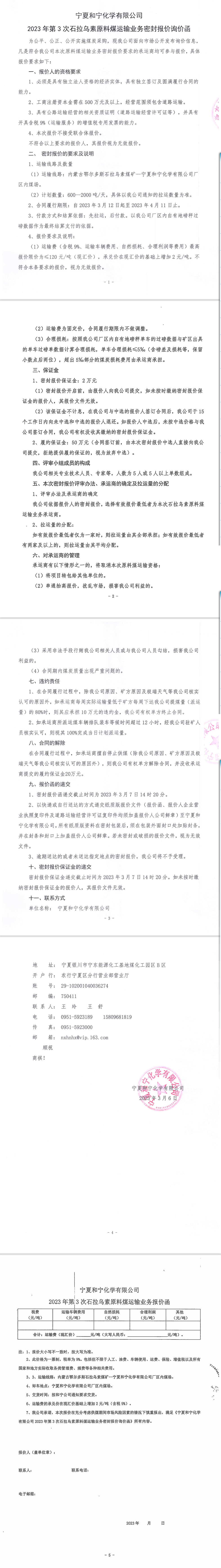 寧夏和寧化學有限公司2023年第3次石拉烏素原料煤運輸業務密封報價詢價函