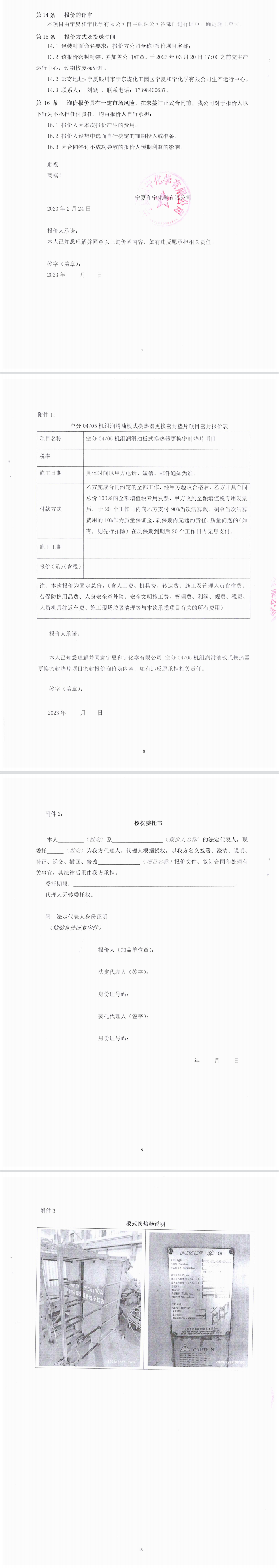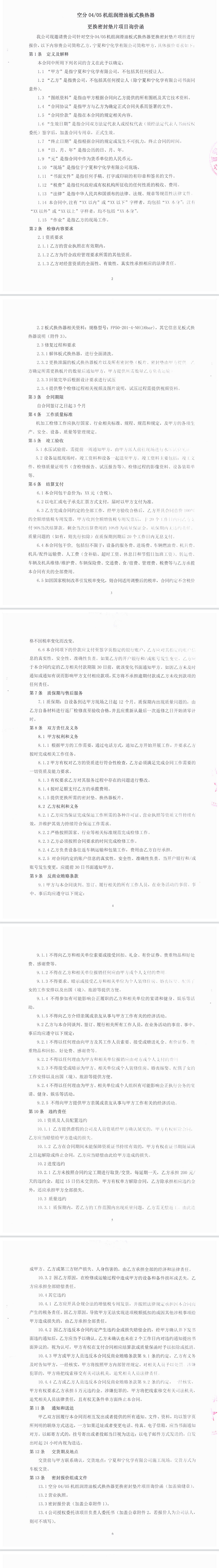 空分0405機組潤滑油換熱器更換密封墊片項目 - 詢價函