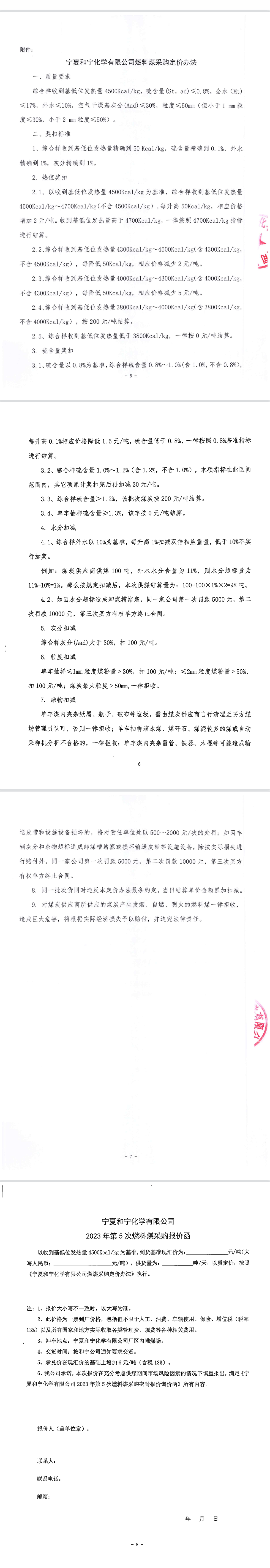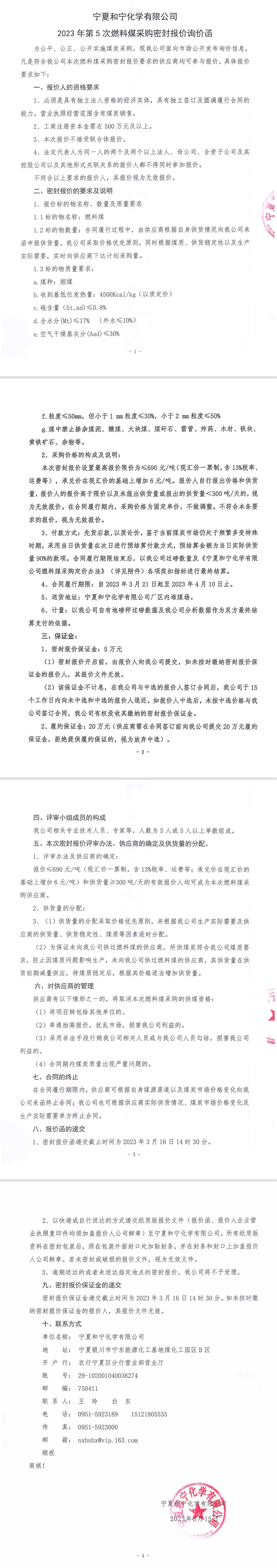 寧夏和寧化學(xué)有限公司2023年第5次燃料煤采購(gòu)密封報(bào)價(jià)詢(xún)價(jià)函
