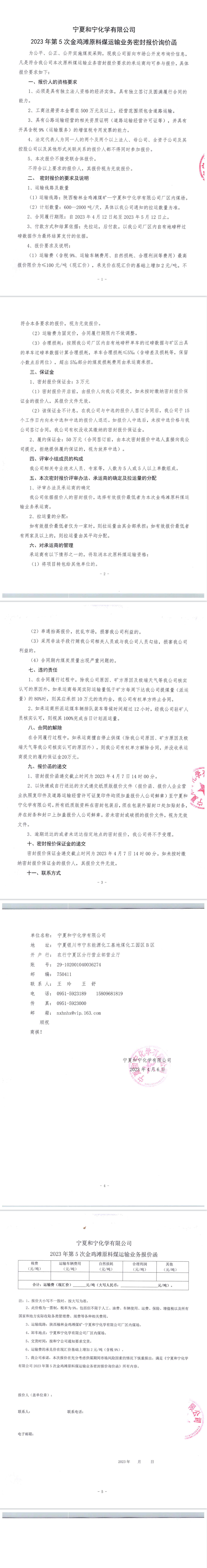 寧夏和寧化學有限公司2023年第5次金雞灘原料煤運輸業務密封報價詢價函
