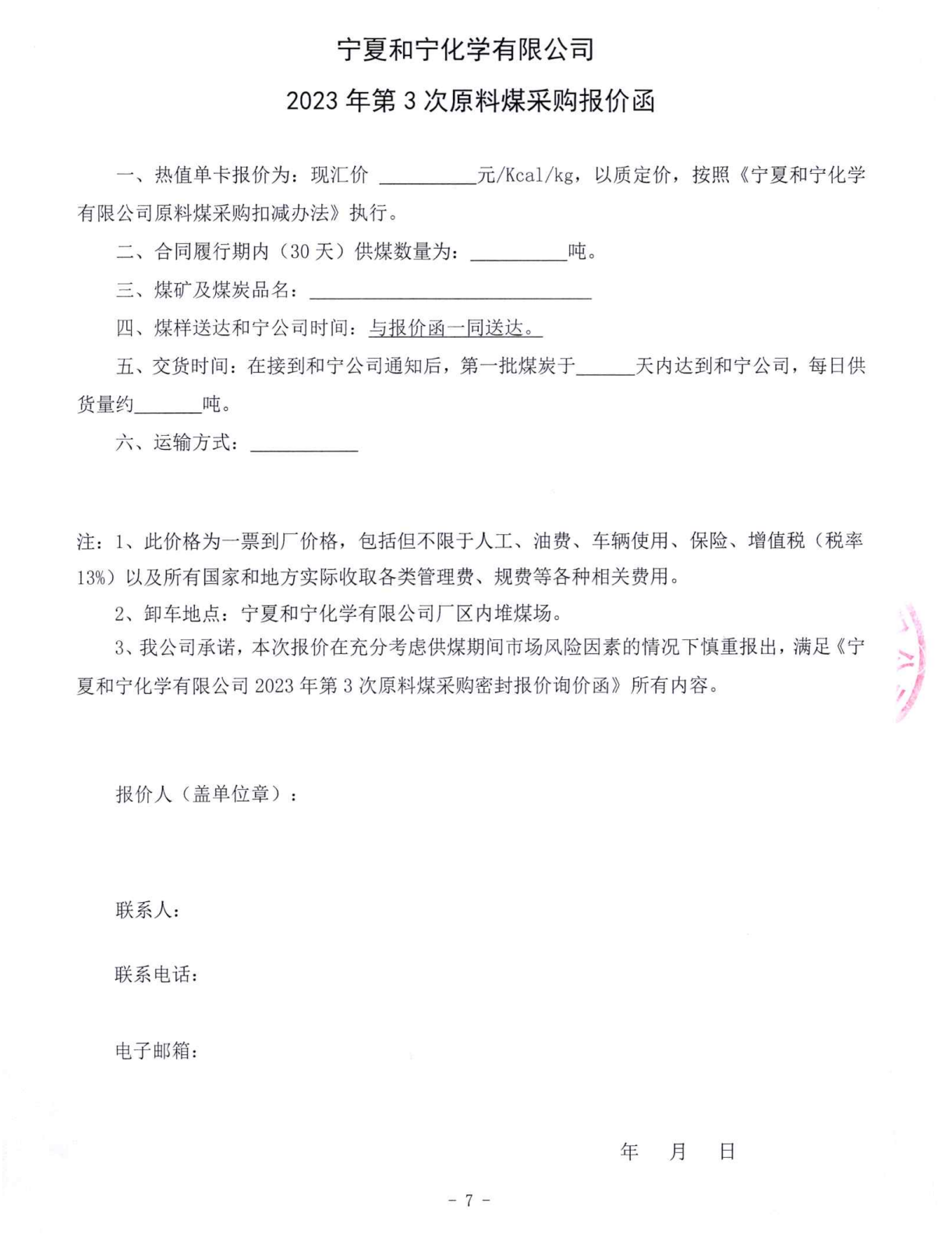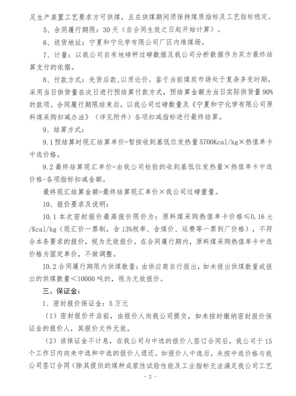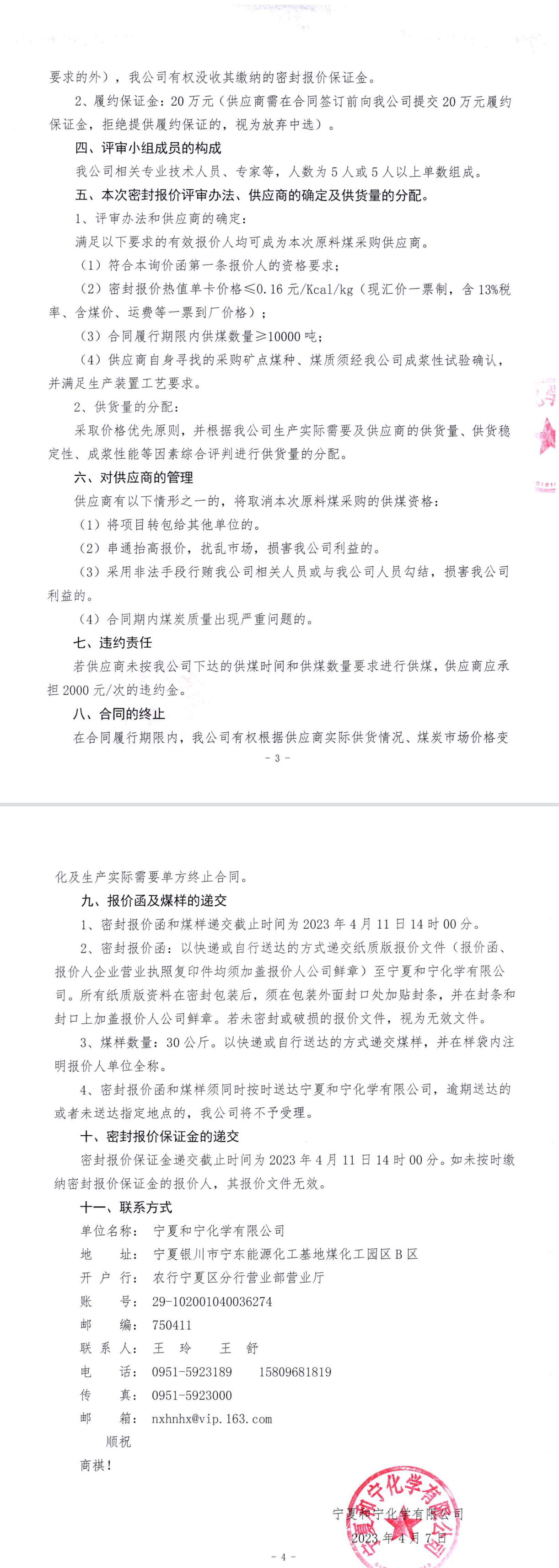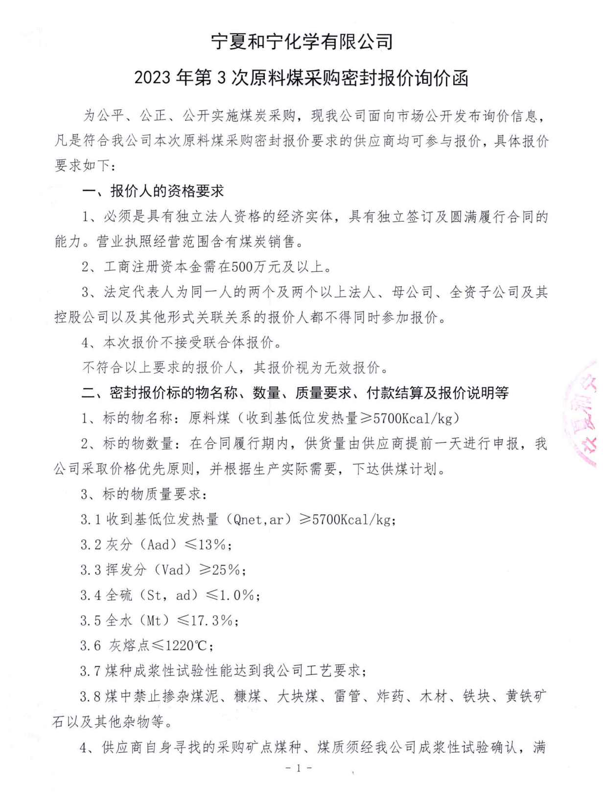 寧夏和寧化學有限公司2023年第3次原料煤采購密封報價詢價函