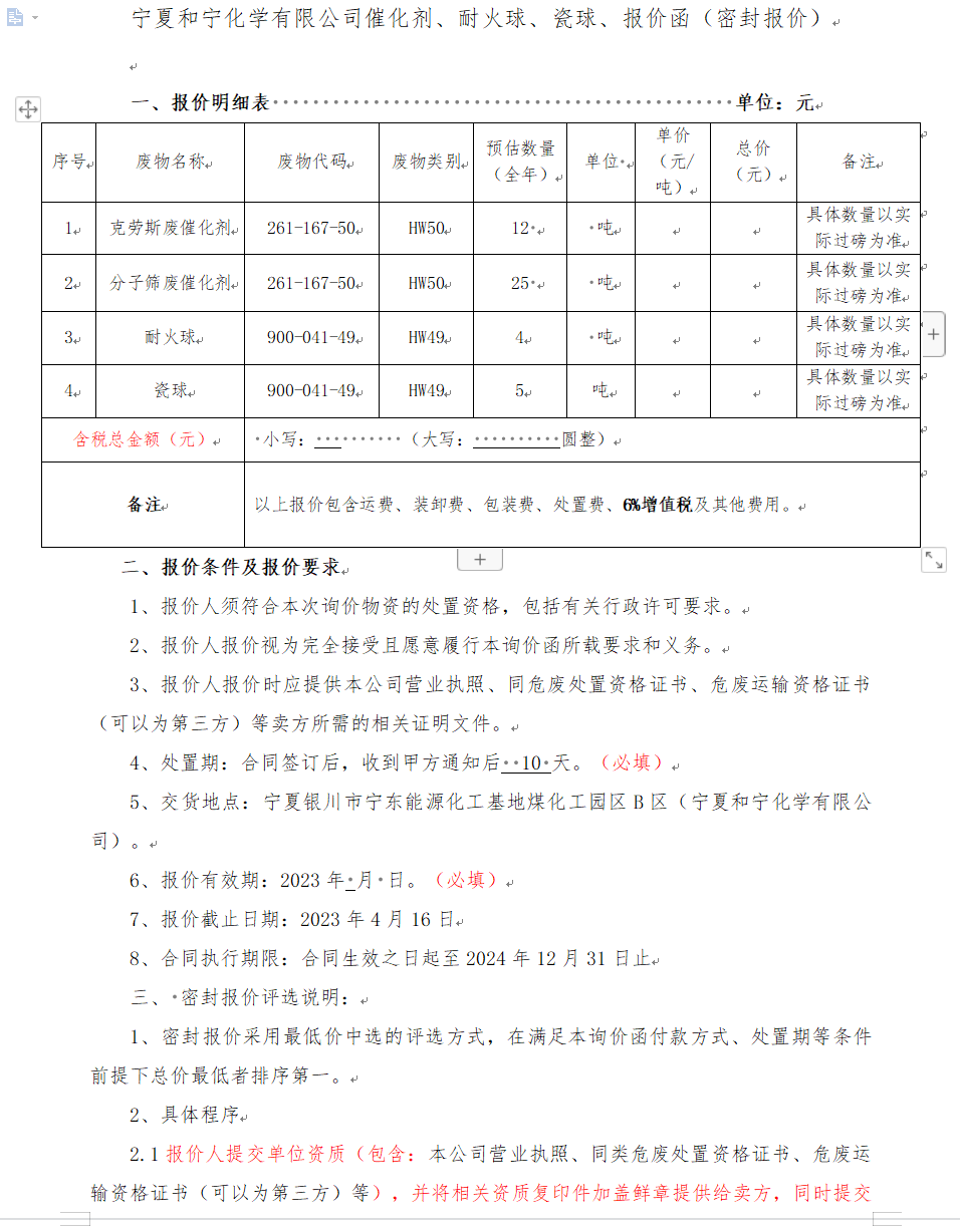 寧夏和寧化學(xué)有限公司催化劑、耐火球、瓷球、報(bào)價(jià)函(密封報(bào)價(jià))