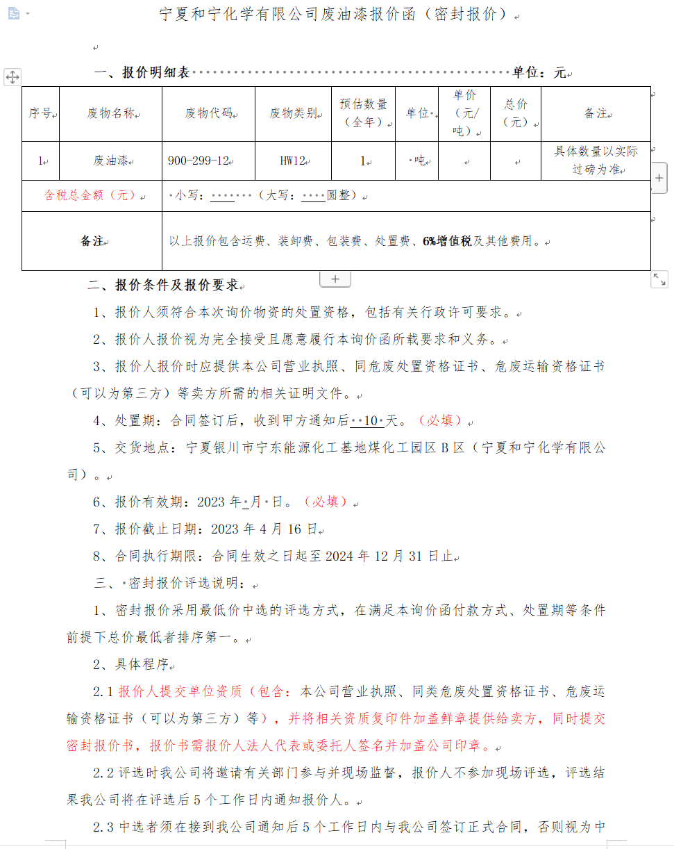 寧夏和寧化學有限公司廢油漆(密封報價)
