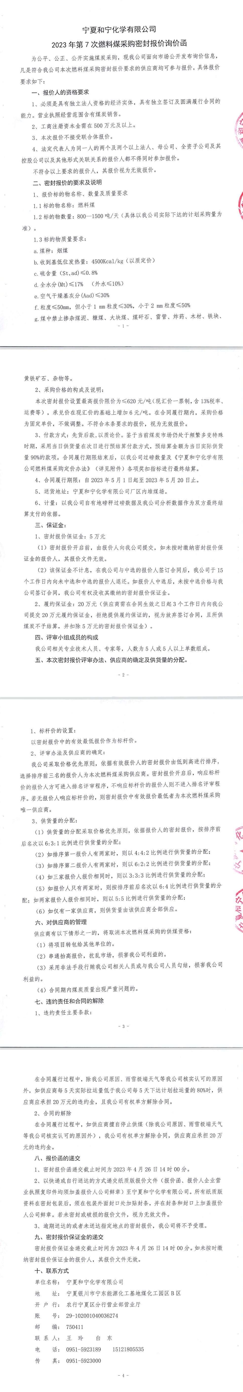 寧夏和寧化學有限公司2023年第7次燃料煤采購密封報價詢價函